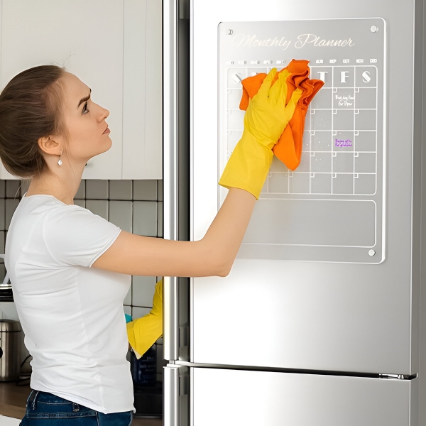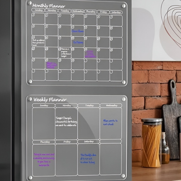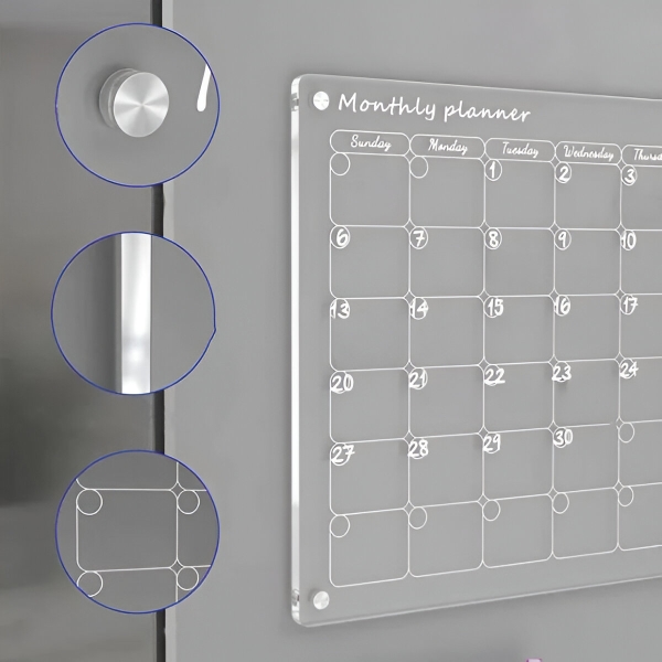Popieriniai planuokliai pasibaigia po mėnesio ir keliauja tiesiai į šiukšliadėžę. Skaidrus akrilinis paviršius visiškai švariai nusivalo per kelias sekundes su pridedama šluoste – jokių šešėlių, jokių dėmių, jokių likučių. Paviršius yra atsparus įbrėžimams ir dėmėms, todėl lieka krištolo skaidrumo po šimtų valymų.