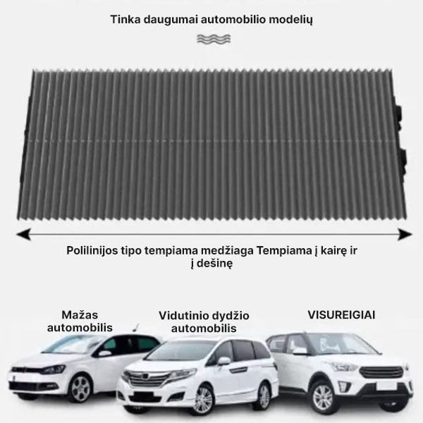 Šis saulės skydelis sukurtas taip, kad tiktų įvairiems automobiliams, įskaitant lengvuosius automobilius, mikroautobusus, sunkvežimius ir visureigius. Tai universalus pritaikymas, nes galite paprasčiausiai nupjauti plotį iki norimo dydžio.