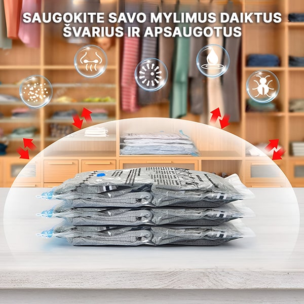 Trūksta vietos saugojimui? Sutaupykite iki 80% vietos su mūsų vakuuminiais maišais! Tiesiog supakuokite – užsandarinkite – ir išsiurbkite orą, kad sumažintumėte tokius didelius daiktus kaip drabužiai, antklodės ir patalynė. Daugiau vietos, mažiau netvarkos!