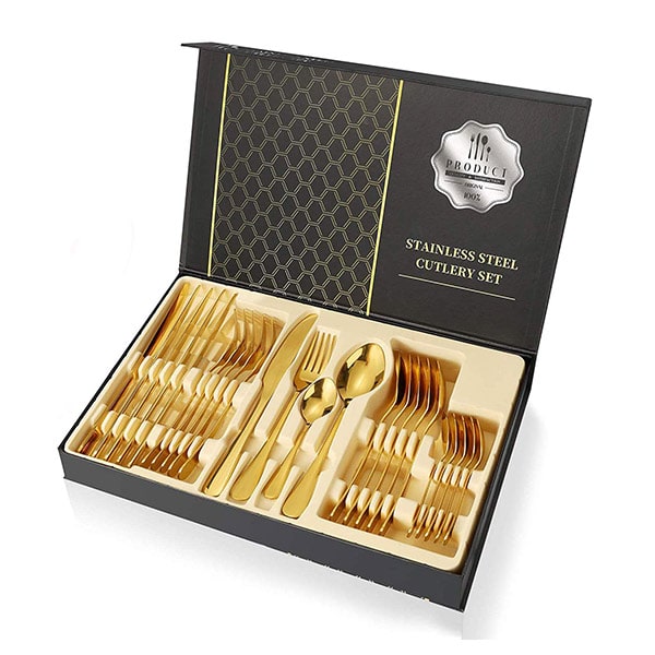 Iš aukščiausios kokybės medžiagų pagamintas prabangių stalo įrankių rinkinys yra patvarus ir ilgaamžis.